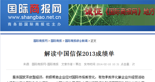 文章原題:解讀中國(guó)信保2013成績(jī)單 文章地址:www.shangbao.net.cn/epaper/gjsb/254154.html 正文如下: 服務(wù)國(guó)家開(kāi)放型經(jīng)濟(jì),積極幫助企業(yè)應(yīng)對(duì)國(guó)際市場(chǎng)新變化,有效承